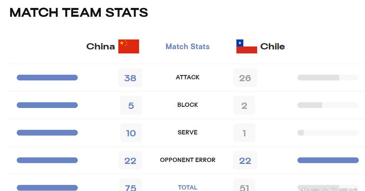 中国女排在面对智利女排时占尽优势,进攻得分达到38-26,拦网5-2,发球则以10-1大幅领先,最终以整整24分的悬殊分差赢得比赛,特别是第三局的25-15,完全体现了中国队的统治力。